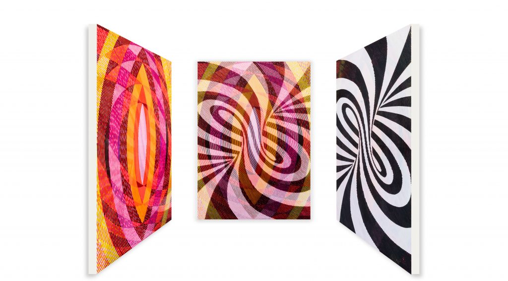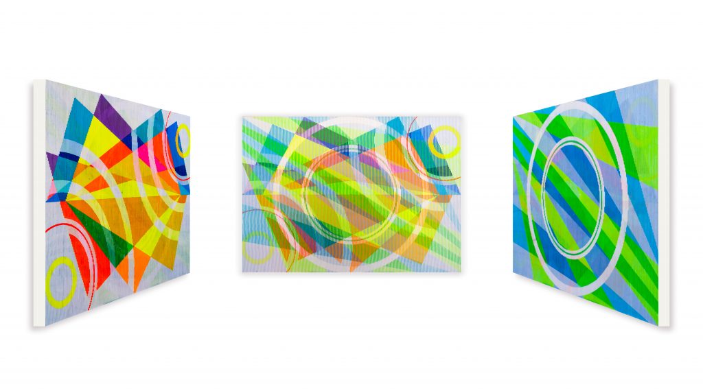 Tradition der Op-Art und der kinetischen Kunst anknüpft. Gleichzeitig erschöpfen sich seine Arbeiten nicht in rein optischen Effekten. Vielmehr eröffnen sie vielschichtige Bildräume, die den Blick in Bewegung versetzen. Beim Betrachten scheint sich das Gefüge der Formen immer wieder neu zu ordnen: Farben verändern ihre Wirkung je nach Standpunkt, Strukturen verschieben sich, und scheinbar stabile Ordnungen geraten ins Fließen. So entstehen Bildwelten, die eine permanente Bewegung suggerieren und den Betrachter dazu einladen, immer neue Perspektiven zu entdecken.